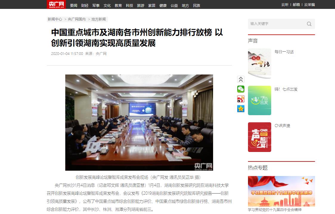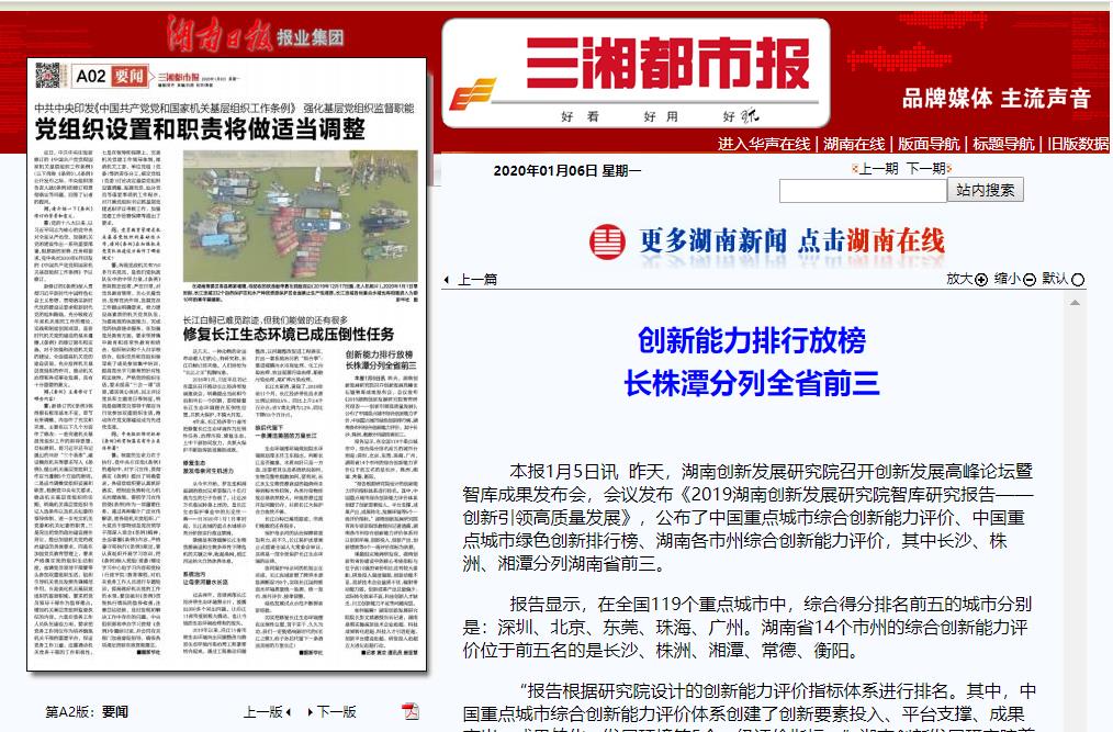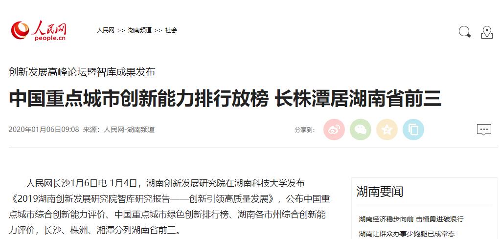 1月4日,湖南创新发展研究院在湖南科技大学召开创新发展高峰论坛暨智库成果发布会,会议发布《2019湖南创新发展研究院智库研究报告——创新引领高质量发展》,公布了中国重点城市综合创新能力评价、中国重点城市绿色创新排行榜、湖南各市州综合创新能力评价,其中长沙、株洲、湘潭分列湖南省前三。