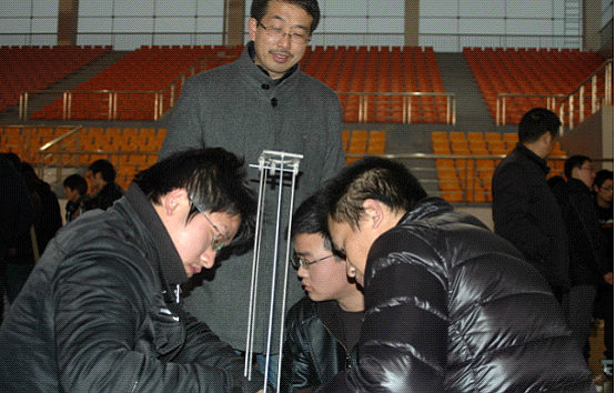 “成功的花需要汗水来浇灌”。我校参赛选手在比赛的前一晚彻夜未眠,集中精力地对设计作品进行调试。我校机电工程学院副院长胡忠举、毛征宇、邓朝辉作为比赛的指导老师,全程参与,就凸轮传动比和摩擦力方面作出指导,并一再强调“一定要调整好小车的方位再运行”。在预决赛中,所有参赛作品都以“将重力势能转化为动能”为理念进行规范设计。我校八支参赛队伍按抽签方式一一出战,但由于方位微差问题,最好的一支队伍也未达到预期效果。但最终“6个S,11米”的好成绩也群压对手,我校的6支队伍获二等奖,跻身前列。