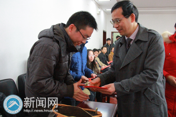 戴树根宣读资助名单。朱川曲与戴树根一起为受资助的同学发放慰问金,还向同学们致以新年的祝福。