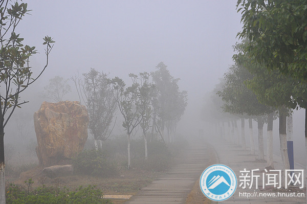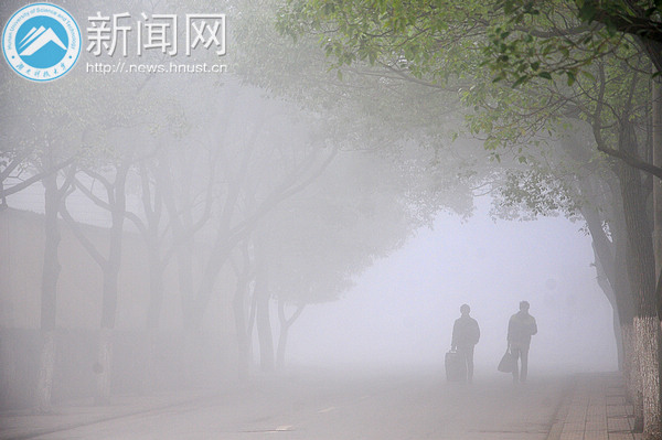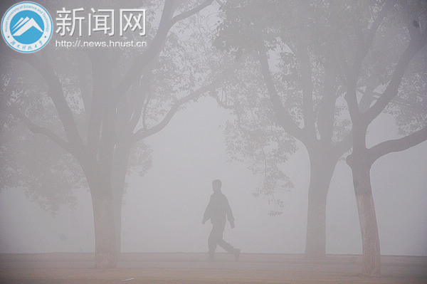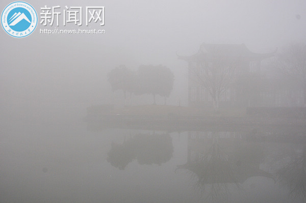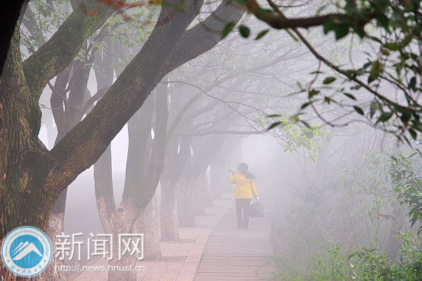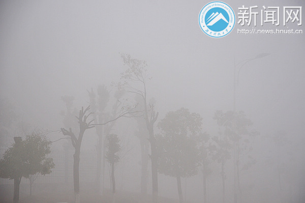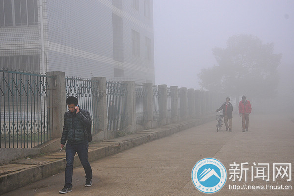 2月23日清晨,整个校园笼罩在雾气中,犹如披着一层面纱。校园内浓度最大的区域能见度不到几十米,直至上午10点左右,大雾才逐渐散去。