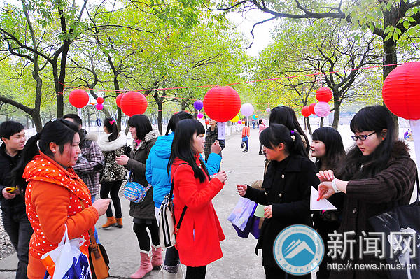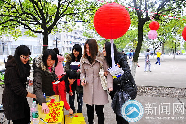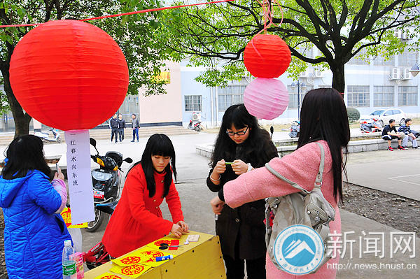 上午九点开始,潇湘学院谭亚林、肖梓伊和雷昆便开始忙活,三位热爱传统文化、古代文学的姑娘撑开灯笼,挂上早已准备好的灯谜,还不忘吸引同学的目光:“猜对八个以上灯谜的人都能得到我们亲手剪的窗花,还可以拍照留恋。”