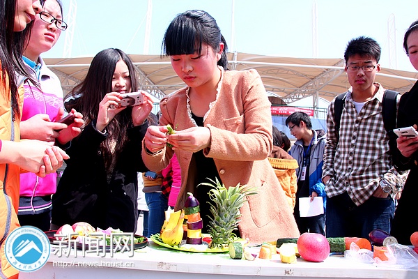 3月5日下午,由化学化工学院主办、人文学院和外国语学院协办的果蔬冷拼大赛在外语楼前的篮球场举行,为大一的女生们庆祝大学以来的第一个女生节。三大学院的12级女生们以寝室为单位,提着装满各种水果的大袋小袋,拿着水果刀、果盘,在春日暖阳中“开工”了。