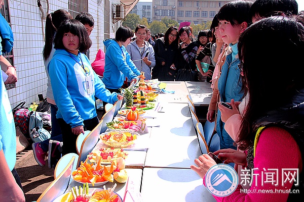 清爽的大海,金黄的沙滩,可爱的小狗和金鱼,这些分别是用黄瓜、苹果、香蕉、圣女果做成的。“它的名字叫做‘面朝大海,春暖花开’。”人文学院的陈莹莹热情地向大家介绍自己和姐妹们的“成果”。