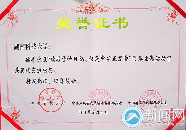 近日,湖南省教育厅、中共湖南省委互联网宣传办公室、湖南省互联网信息办公室发文(湘教通【2013】63号),对“续写雷锋日记、传递中华正能量”网络主题活动优秀日记作品作者和优秀组织单位进行表彰。我校喜获优秀组织奖。谭燕同学的《人生方寸,爱无疆》被评为优秀日记作品三等奖。