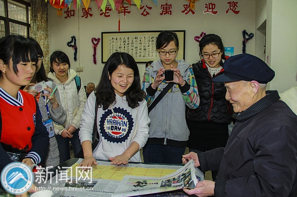 刚走进敬老院,志愿者们显得有点紧张局促,团长庞雪娟鼓励大家主动和爷爷奶奶交谈。大家被团长的积极活泼感染了,三五成群的依偎在爷爷奶奶身边聊起天来,“奶奶,我是广东,她是娄底的”,志愿者们握着爷爷奶奶的手,寻找老乡的同时传来阵阵笑声。“快来看,爷爷的字写得真好,爷爷你原来是做什么的啊”、“爷爷你教我写字吧”,志愿者们叽叽喳喳地围着一名退休教师爷爷,爷爷听到夸奖连忙笑着说,“不敢当,好久没有写过了,你们一定比我写的好。”康思雨是志愿者中爱写毛笔字的女孩儿,她来到爷爷旁边请教,二人一起写下万事如意、身体健康等祝福语。