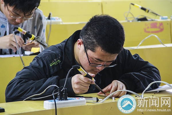 12级电子俱乐部的郑云龙每一个焊接都要确认多次。比赛过后,他舒了一口气,“做的还算满意,同时也看到意识了自己布线上的不足。”来自信息学院12级的周源是第一次参加类似的电子制作大赛。由于缺少经验,制作过程不算顺利,他还是用手机拍下了贴有自己名字的作品,表示要留作纪念。