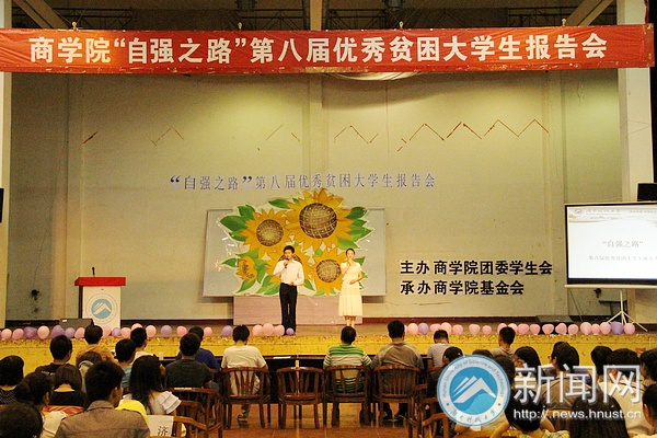 4月18日晚,我校商学院在南区活动中心举行第八届“自强之路”优秀贫困大学生报告会。商学院何佳等七位报告人汇报了自己通过努力和坚持战胜困难、不幸的历程,向观众传递了正能量。商学院相关负责人与10级和11级辅导员及12级学生代表一起聆听了报告会。
