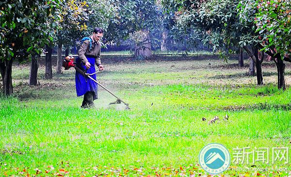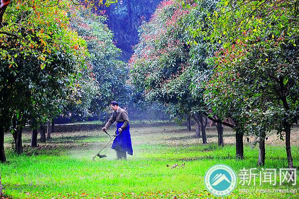 微风轻抚,校园里处处焕发出春的气息,我校绿化管理处的工作人员却忙个不停。由于春天花草生长较快,工作人员须及时对花草进行修剪。图为南校区桂花园里工作人员正在给杂草“理发”。