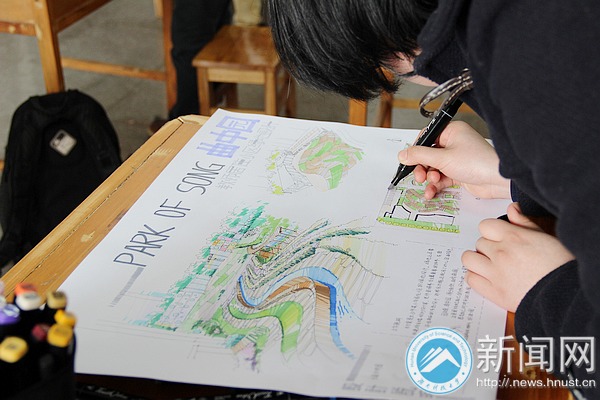 各种型号的工具笔、各色尺子……纸上是简单的线条,流动的色彩,一张张让人身临其境的建筑或景观图纸正从大学生们手中“新鲜出炉”。3月31日,我校第五教学楼和土木楼的考场内,参加湘潭市第二届大学生手绘大赛的同学们正投入地创作着手绘作品。