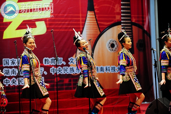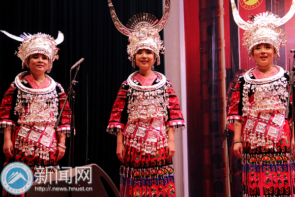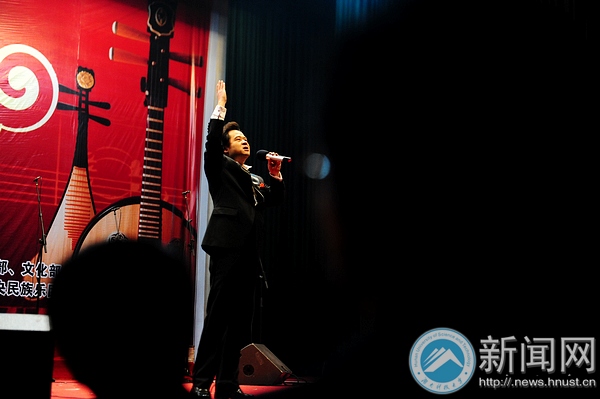“来自”侗族和苗族的姑娘们一出场便博得满堂喝彩。10位歌唱家身着民族传统服装,头戴精致银饰,唱起根据两族民间音乐编曲的《这山唱那山》。甜美清亮的歌声富于高低变化,她们轻踏舞步,沙沙作响的银饰成了最佳配乐。据哈萨克族民歌改编的《玛依拉变奏曲》由花腔女高音谢琳演唱,其高难度的演唱技巧让观众惊叹不已,而后她又加唱一首京剧改编曲《苏三起解》,婉转的京剧唱腔加上到位的眼神和京剧表演手型,谢琳已俨然是一位“红衣苏三”。歌唱家们在演唱中还热情地与观众互动。在演唱《少林少林》时,男声四重唱的歌唱家一齐走下舞台和观众握手互动,《阳光路上》的演唱者尤龙也把“音乐阳光”带入了观众当中。“湖南的乡亲们,你们好!”女生三重唱的歌唱家则用湖南方言和观众问好,亲切感十足。台下来自马克思主义学院的郜桐彤随着音乐挥舞着双手,说到:“虽然我是跳街舞的,没怎么接触过民乐,但音乐是相通的,这对我来说无疑是一场心灵的洗礼,感谢他们的到来。”此外,《春来了》等合唱节目的恢弘大气也给观众留下了深刻的印象,时而激昂,时而悠扬的旋律加以丰富的唱法,令台下观众如痴如醉。