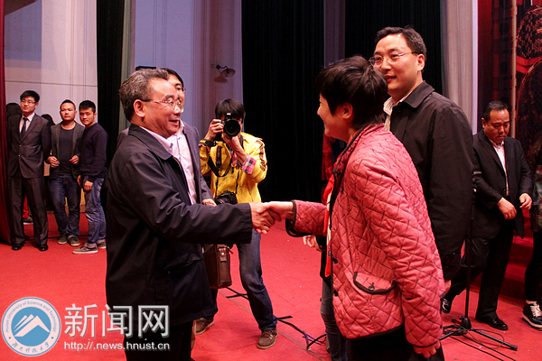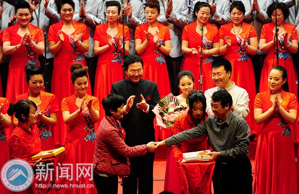 音乐会在大合唱《万泉河水清又清》和《远方的客人请你留下来》中慢慢结束。校党委书记田银华上台亲切接见了中央民族乐团演员们,并与乐团成员合影留念,副校长胡石其与中央民族乐团副团长吴玉霞交换礼物,为音乐会画上了圆满的句号。