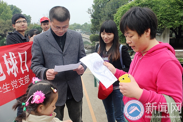 一位母亲接过传单后对身边的女儿说:“记得要保护地球,不要乱扔垃圾哦。”并热心地同女儿一起帮忙发起了传单,小女孩脸上露出充满稚气的笑容。最后,全体党员拉着横幅一同在雨湖公园进行宣传。