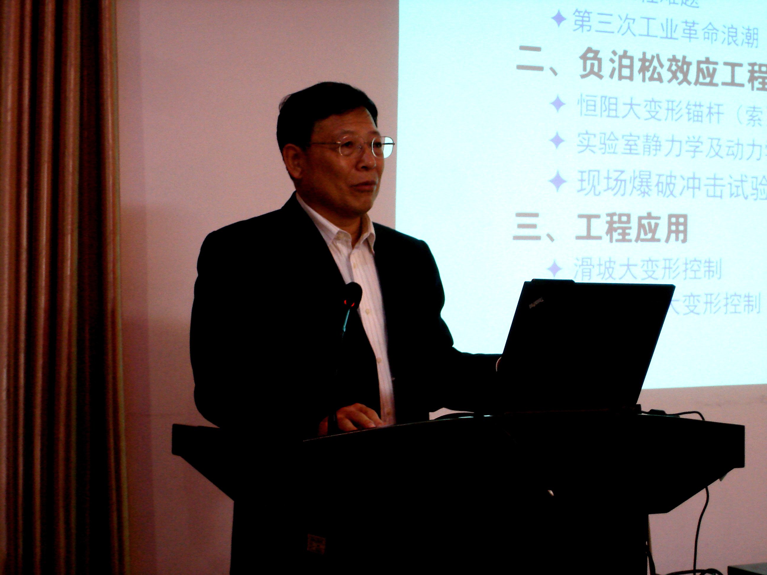 中国矿业大学何满潮教授应湖南科技大学的邀请,于2013年11月22日下午,在湖南科技大学能源与安全工程学院会议室作了“具有负泊松效应锚杆(索)实验研究及其工程应用”的学术报告。报告会由湖南科技大学正校级督导冯涛教授主持,能源学院部分教授、博士和在校研究生参加了报告会。