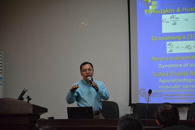 杨先一教授接着作了主题为《Biologically inspired intelligent approach with application to robotics and control systems》的学术报告。报告中,杨教授主要围绕模糊控制系统、神经网络、遗传算法、混合系统等方面内容,着重介绍了神经网络和改进粒子群优化算法等在养猪场气味监测增强型电子鼻、多机器人系统、番茄收割机器人等方面的应用研究,同时结合每个不同领域播放了相关现场测试和仿真实验录像。