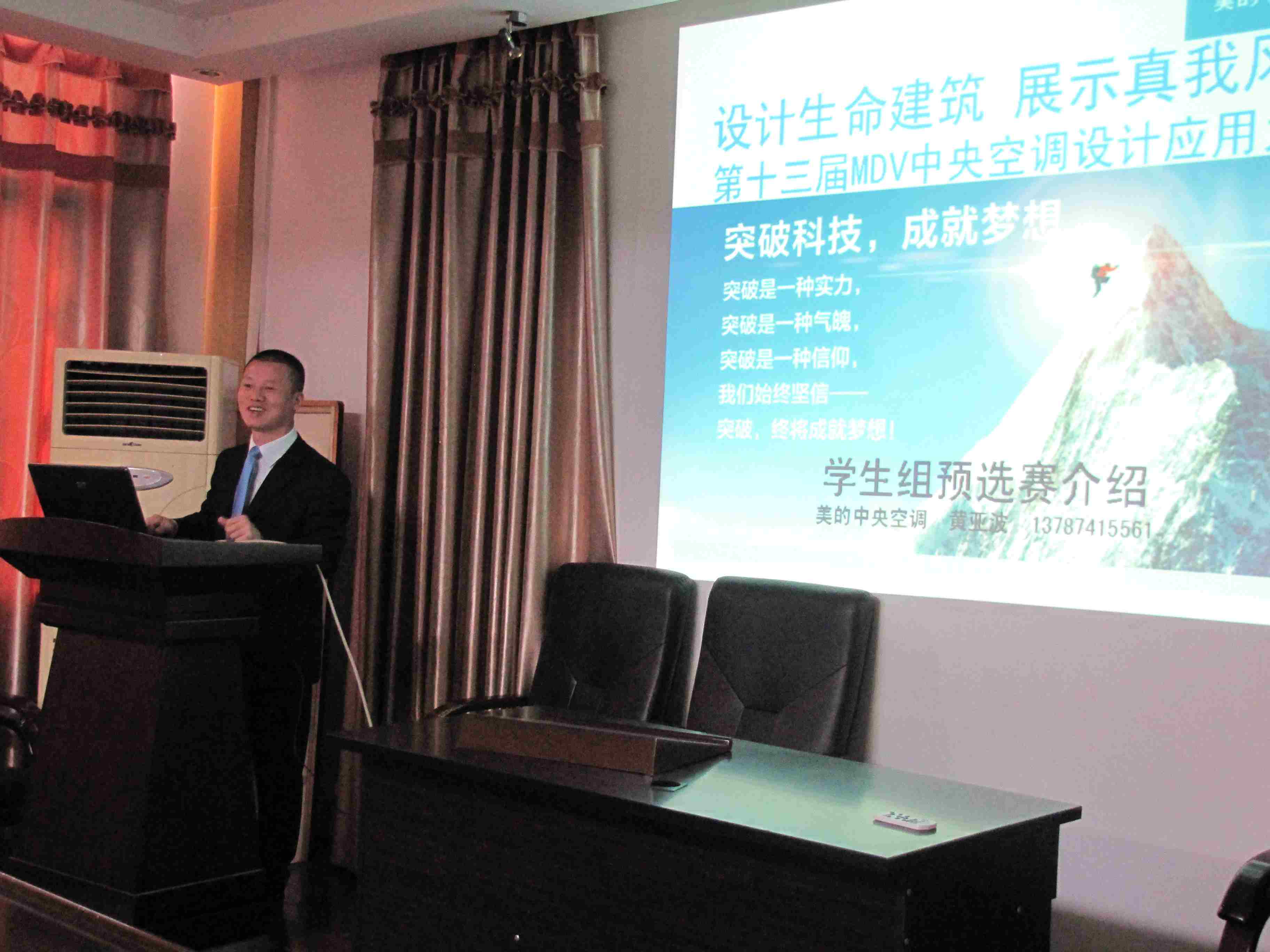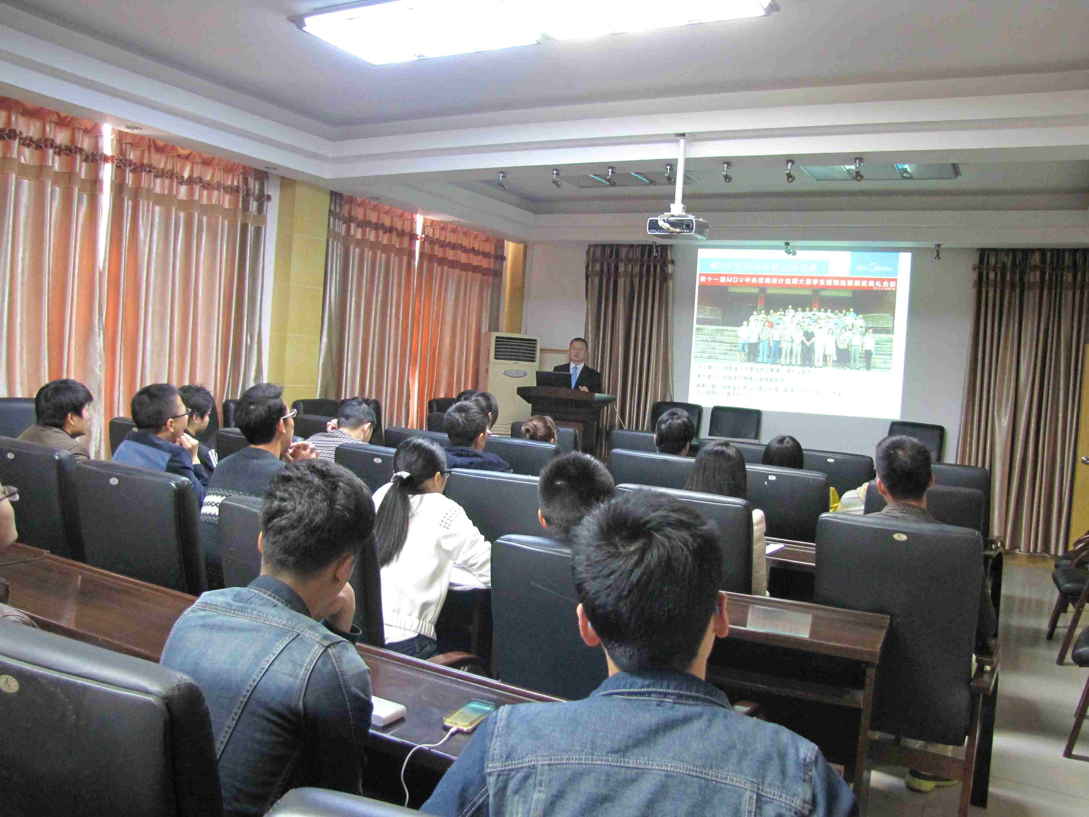2015年4月14日上午,能源与安全工程学院举行了MDV中央空调设计应用大赛学生组预选赛的动员会,美的中央空调湖南分公司市场管理部负责人黄亚波代表大赛组委会作了动员报告,能源学院建筑环境与能源应用工程专业2015届学生、邹声华副院长等院领导及部分老师出席了动员会。